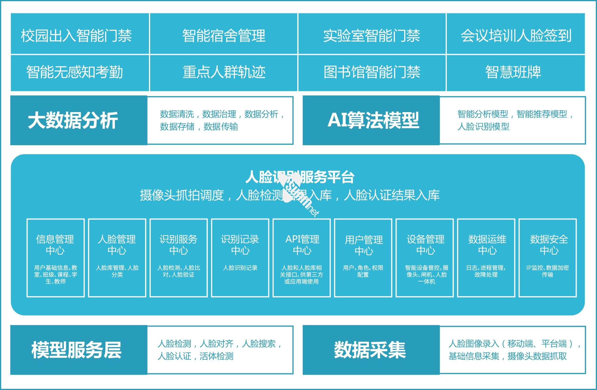 三盟科技在人臉識別技術(shù)上,經(jīng)過持續(xù)的研發(fā)積累,目前已經(jīng)擁有一整套自研的基于深度神經(jīng)網(wǎng)絡(luò)的人臉識別相關(guān)算法模型,包括人臉檢測,關(guān)鍵點定位,情緒識別,活體檢測,人臉認(rèn)證等,準(zhǔn)確率業(yè)界領(lǐng)先,并且后續(xù)還將持續(xù)不斷優(yōu)化和豐富算法模型。在人臉識別的算法和技術(shù)基礎(chǔ)上,三盟科技開發(fā)完成并推出了人臉識別服務(wù)平臺。將人臉識別技術(shù)全面運用于智慧校園管理和服務(wù),一個“人臉識別服務(wù)平臺”管理全校所有師生的人臉識別特征庫,以人臉識別為基礎(chǔ)支持,實現(xiàn)跨場景、跨應(yīng)用的系統(tǒng)性整合。