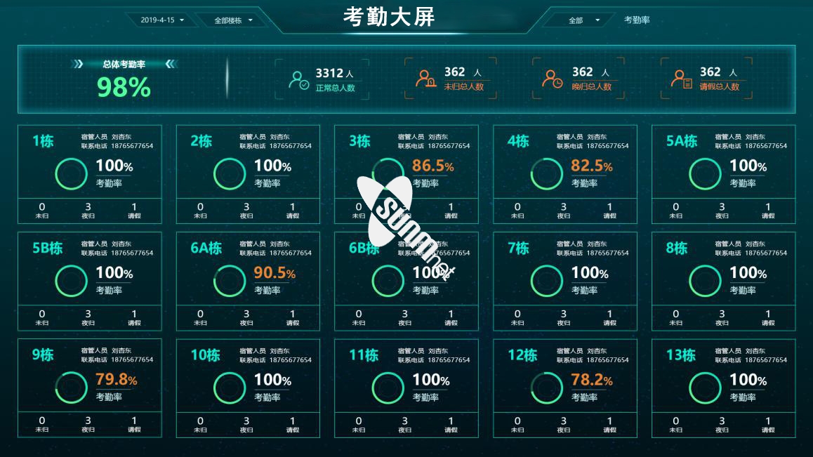 所有宿舍的學(xué)生考勤結(jié)果實時顯示,每個宿舍一樓大廳放置大屏顯示本棟宿舍所有寢室人員的考勤情況,宿舍管理員只要對缺勤的宿舍進(jìn)行查寢,大大地提升了宿舍管理員查寢的效率。