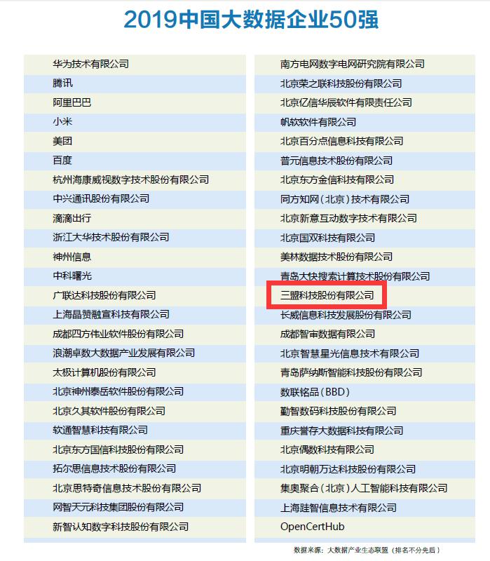 在此基礎(chǔ)上,《2019中國大數(shù)據(jù)產(chǎn)業(yè)發(fā)展白皮書》對基礎(chǔ)支撐層、數(shù)據(jù)服務(wù)層、融合應(yīng)用層等進行了精準的層次化分析,在大數(shù)據(jù)產(chǎn)業(yè)機構(gòu)分析之外,針對大數(shù)據(jù)產(chǎn)業(yè)發(fā)展的爆發(fā)性增長趨勢,總結(jié)并歸納出十大爆發(fā)點,為關(guān)注大數(shù)據(jù)產(chǎn)業(yè)的同行提供了全景式的展望,并梳理出各個領(lǐng)域的龍頭企業(yè),推薦入圍“2019中國大數(shù)據(jù)企業(yè)50強” ,“三盟科技”位列其中。