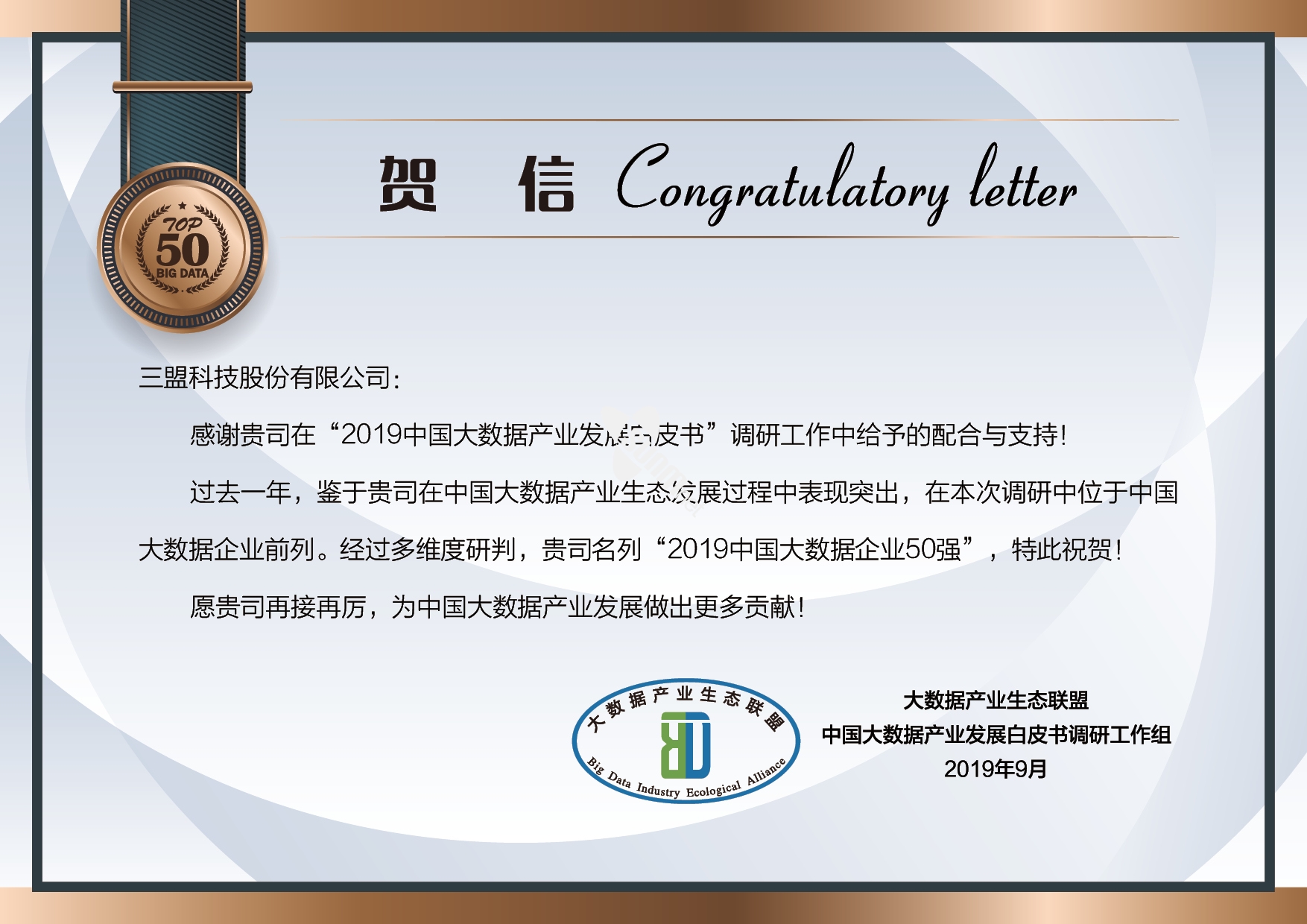 本次“2019中國大數(shù)據(jù)企業(yè)50強(qiáng)”評選不以企業(yè)規(guī)模為入選的核心考核指標(biāo),更加注重企業(yè)的大數(shù)據(jù)技術(shù)能力與行業(yè)應(yīng)用之間的深度融合,對企業(yè)在大數(shù)據(jù)上的研發(fā)投入,大數(shù)據(jù)產(chǎn)品、解決方案及應(yīng)用案例,大數(shù)據(jù)投融資需求及發(fā)展?jié)摿Φ榷鄠€(gè)維度進(jìn)行考核,覆蓋了中國大數(shù)據(jù)產(chǎn)業(yè)生態(tài)鏈上的各個(gè)細(xì)分環(huán)節(jié)。由知名高校、研究機(jī)構(gòu)、行業(yè)用戶CIO、知名投資人、大數(shù)據(jù)企業(yè)領(lǐng)袖專家構(gòu)成的專家委員會(huì)多輪評定,三盟科技從2000余家參選企業(yè)之中脫穎而出,與華為、騰訊、阿里、百度、小米等企業(yè)同時(shí)上榜由中國大數(shù)據(jù)產(chǎn)業(yè)生態(tài)聯(lián)盟組織評選的“2019中國大數(shù)據(jù)企業(yè)50強(qiáng)”。