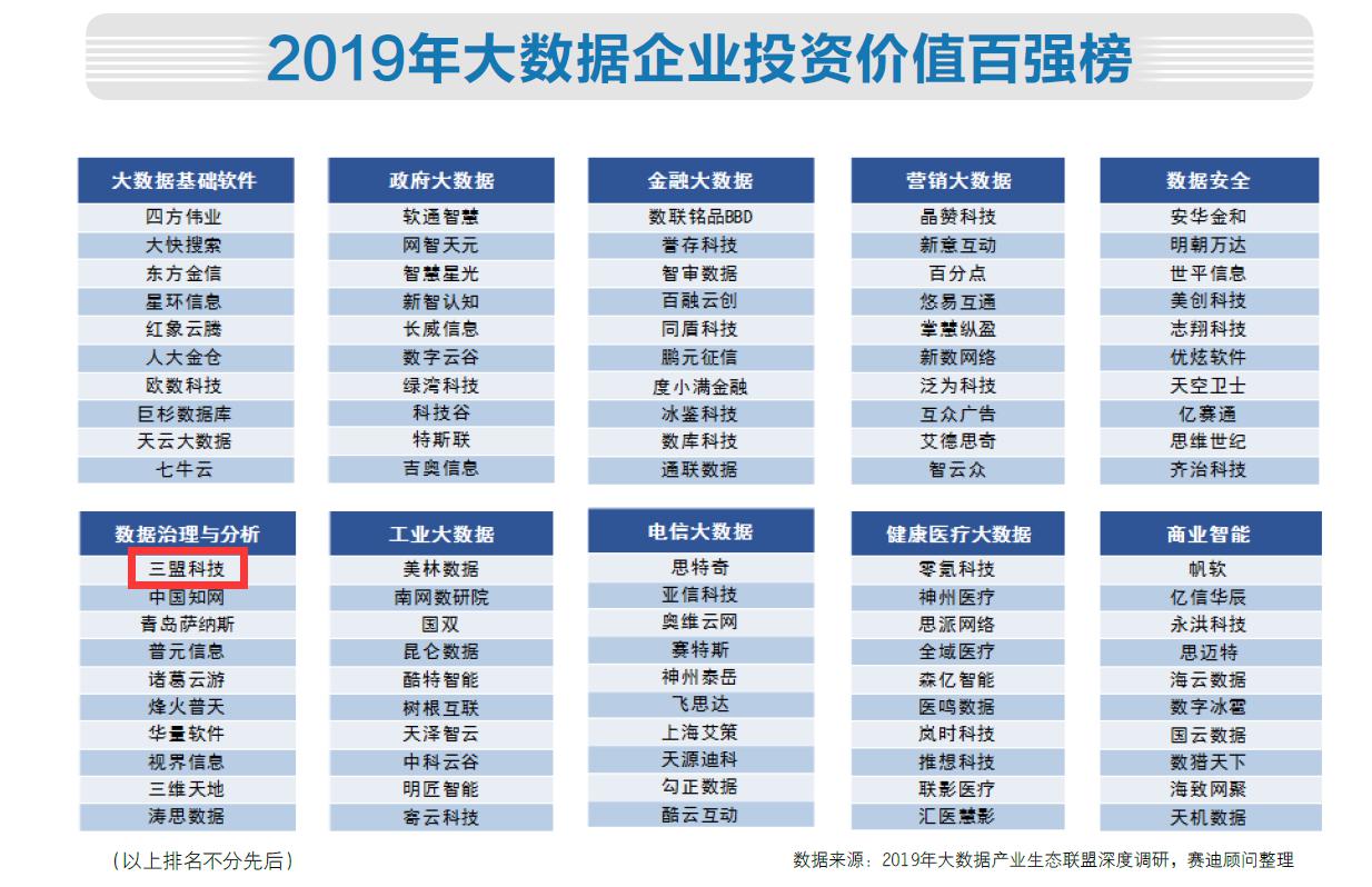 “百強(qiáng)榜”從企業(yè)估值/市值、營收狀況、創(chuàng)新投入、專利數(shù)量、產(chǎn)品競爭力、企業(yè)潛力、領(lǐng)導(dǎo)層能力等多個(gè)維度進(jìn)行定量與定性結(jié)合的評比。經(jīng)過專家打分,三盟科技繼2018年之后,再度成功入圍中國大數(shù)據(jù)企業(yè)投資價(jià)值百強(qiáng)。