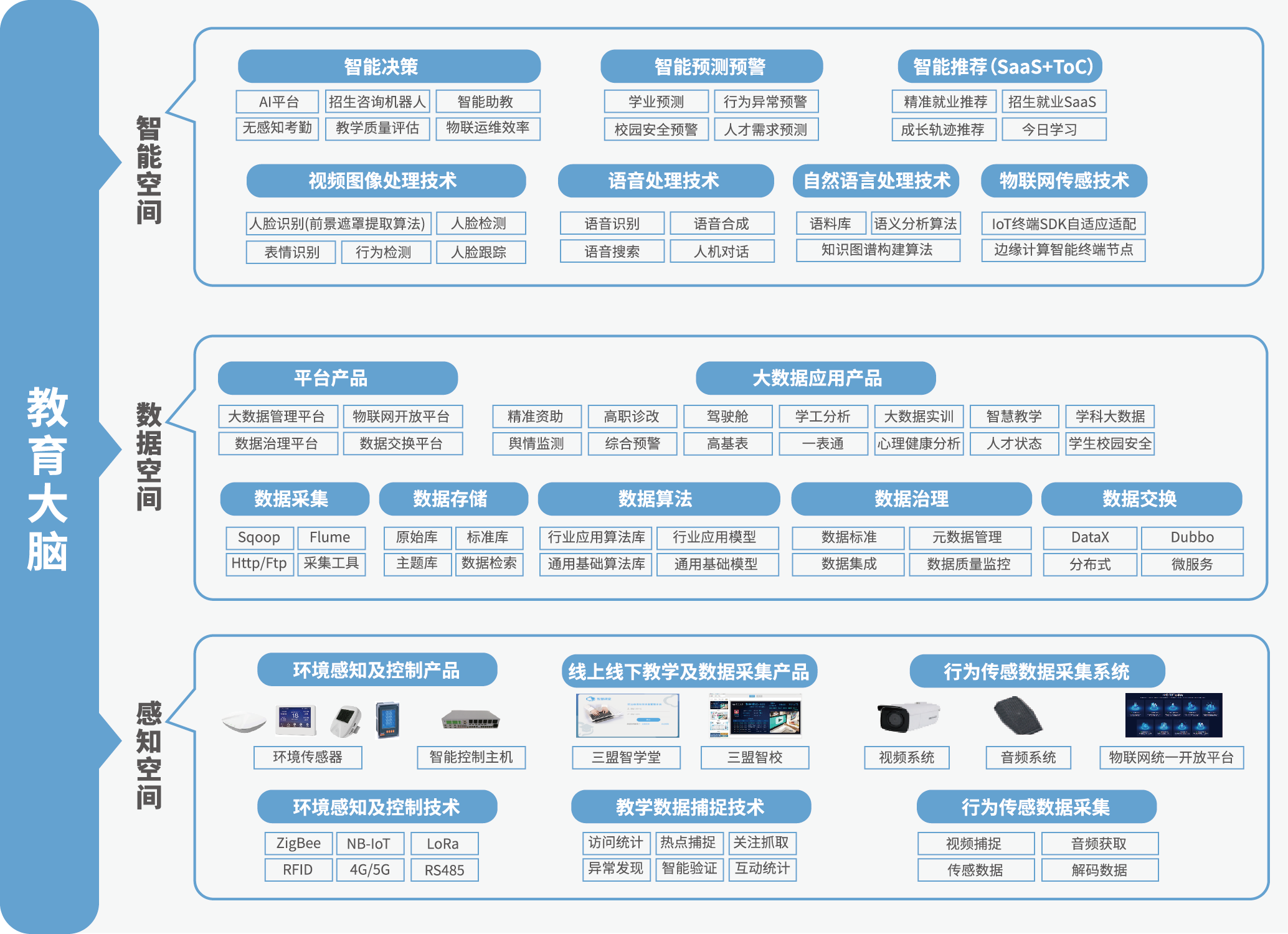 三盟科技“教育大腦”戰(zhàn)略,助力教育單位打造自己的智慧教育大腦、智慧教育人工智能指揮中心,其分別從感知空間、數(shù)據(jù)空間、智能空間為教育用戶提供全方位的、自主研發(fā)的新一代信息技術(shù)、產(chǎn)品與服務(wù)。
