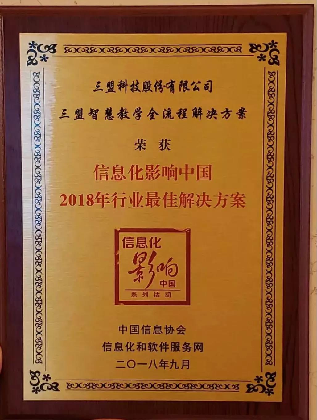 2018年9月20日,由中國(guó)信息協(xié)會(huì)主辦,信息化和軟件服務(wù)網(wǎng)和中國(guó)信息協(xié)會(huì)傳媒中心協(xié)辦的“2018中國(guó)信息化創(chuàng)新發(fā)展大會(huì)在北京舉行。三盟科技憑借在智慧教學(xué)領(lǐng)域的杰出地位,應(yīng)邀出席了本次大會(huì),其三盟智慧教學(xué)全流程解決方案在“信息化影響中國(guó)·2018獎(jiǎng)項(xiàng)評(píng)選活動(dòng)”中斬獲“2018教育行業(yè)最佳解決方案”大獎(jiǎng)。