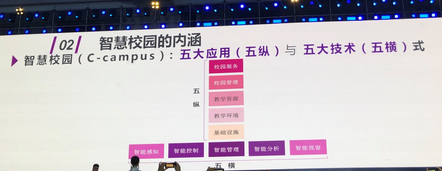 “五縱”,主要有五塊建設(shè)的具體方面。最基礎(chǔ)的是網(wǎng)絡(luò)通信傳輸,這是最基本的,我們說沒有網(wǎng)絡(luò),沒有高效、高速的帶寬,一馬擋路,萬馬不能前行,要建信息化校園,要建智慧校園,就要把快速路、高速路修好;在這個網(wǎng)絡(luò)通信平臺支撐的,最核心的學(xué)校以培養(yǎng)人才為本,那就是教學(xué)科研活動的場所,教學(xué)環(huán)境;再往上,支撐教學(xué)科研活動和實踐活動所需要的各類資源,就是教學(xué)資源;支撐整個校園管理治理體系的行政、辦公、事務(wù)這塊,智慧校園的管理;再往上一塊,是整個信息化公共服務(wù)支撐體系叫智慧校園的服務(wù)。這就是智慧校園的“五橫五縱”的概念。