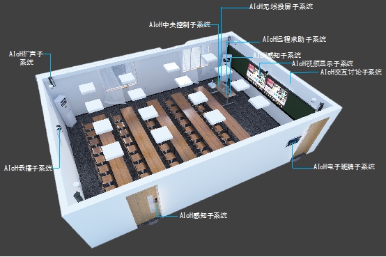 AIoH視頻顯示子系統(tǒng)、AIoH中央控制子系統(tǒng)、AIoH交互討論子系統(tǒng)、AIoH遠(yuǎn)程求助子系統(tǒng)、AIoH感知子系統(tǒng)、AIoH電子班牌子系統(tǒng)、AIoH錄播子系統(tǒng)、AIoH無線投屏子系統(tǒng)、AIoH擴(kuò)聲子系統(tǒng)等9大智能硬件AIoH子系統(tǒng)全方位建設(shè)智慧教室。