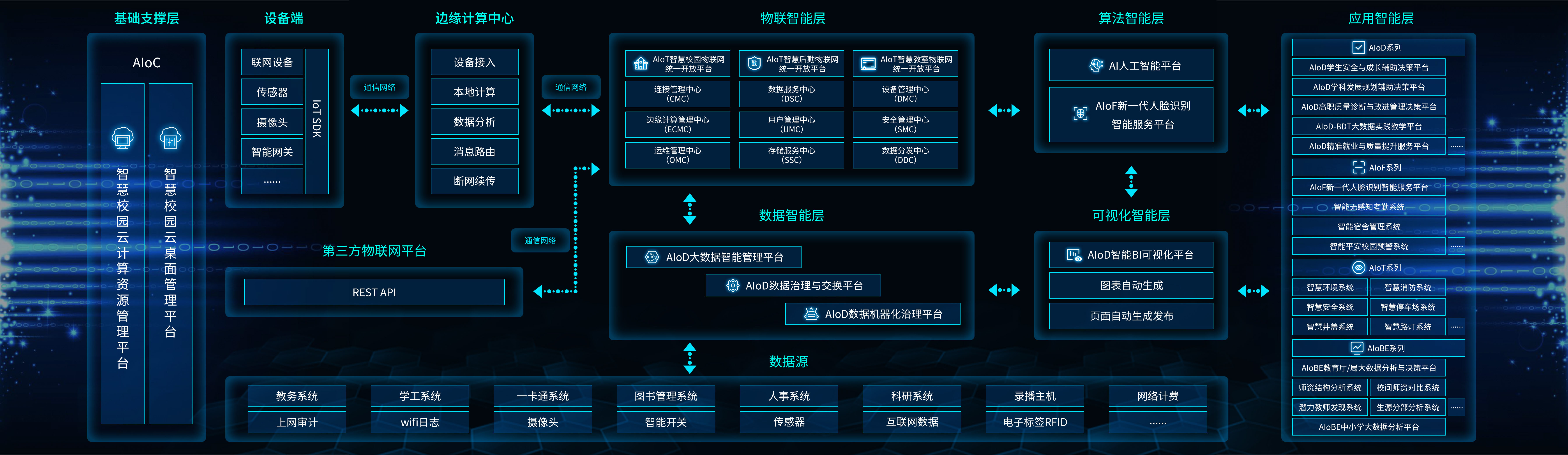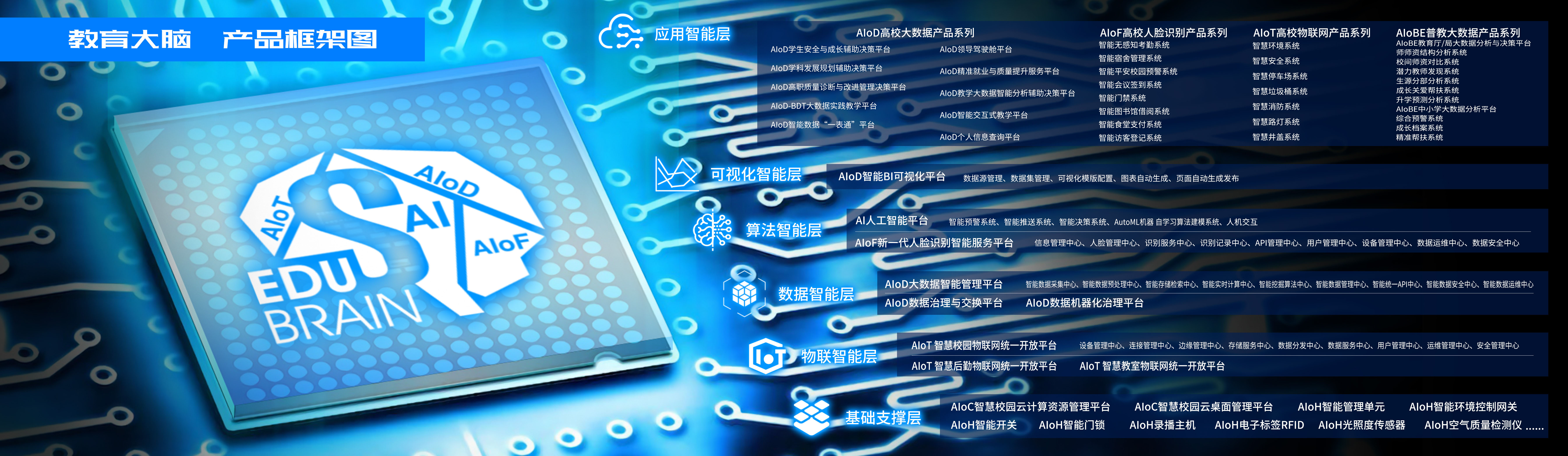 教育大腦智慧校園整體解決方案,融合人工智能技術(shù)AI、大數(shù)據(jù)技術(shù)AIoD、物聯(lián)網(wǎng)技術(shù)AIoT、人臉識(shí)別技術(shù)AIoF四大核心技術(shù)與和基礎(chǔ)支撐層、物聯(lián)智能層、數(shù)據(jù)智能層、算法智能層、可視化智能層、應(yīng)用智能層六大產(chǎn)品方向,包括近百款產(chǎn)品自主研發(fā)平臺(tái)類及應(yīng)用類產(chǎn)品,專為智慧教育,助力教育單位以“AI+大數(shù)據(jù)”為核心的智慧校園建設(shè),打造教育單位自己的智慧教育大腦!