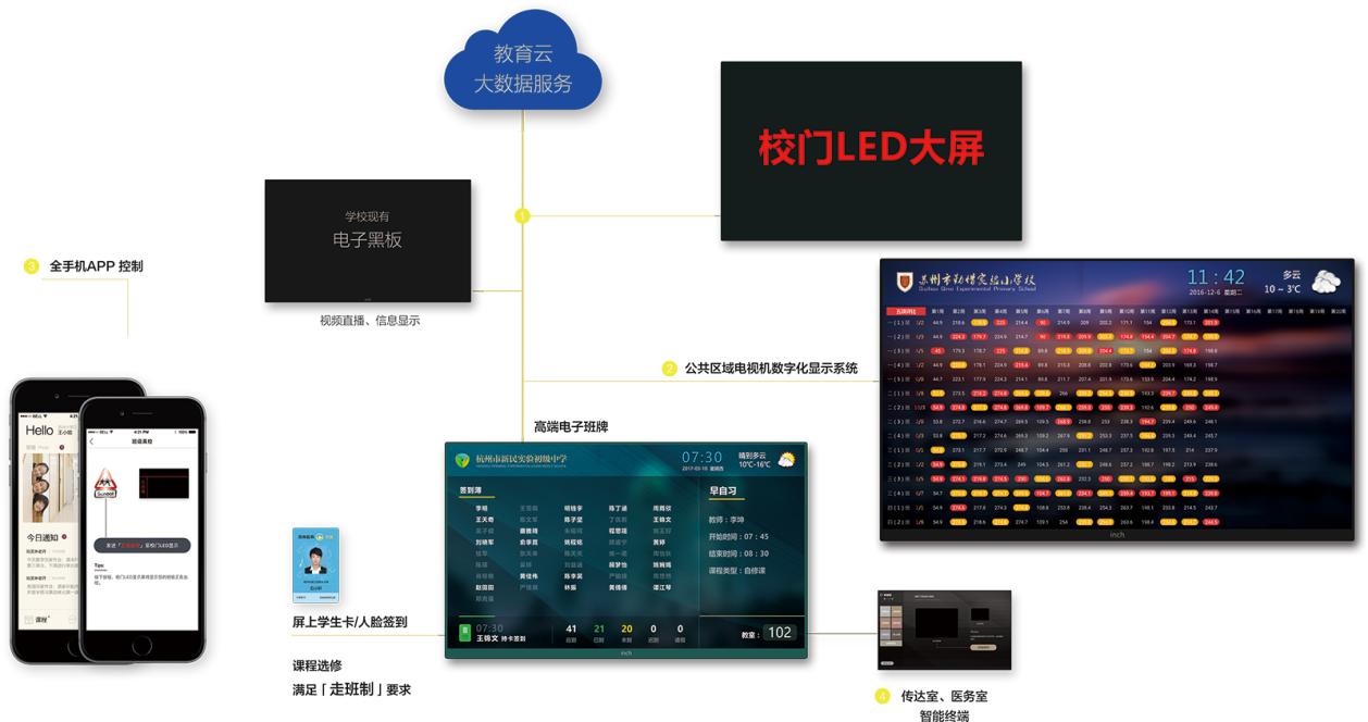 按照充分利舊的原則,將學(xué)校已有的電子黑板、走廊宣傳屏、校門口LED大屏、一卡通等現(xiàn)有設(shè)備進(jìn)行無縫整合,接入智慧校園平臺(tái),與新建設(shè)備一起實(shí)現(xiàn)所有終端的一體化管控與應(yīng)用,實(shí)現(xiàn)無壁壘的智慧化應(yīng)用。