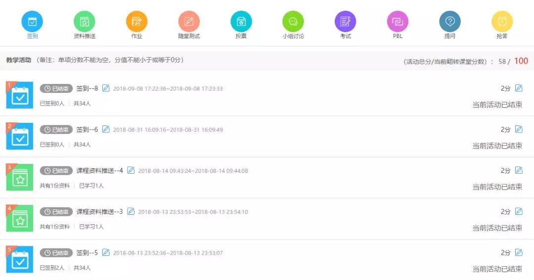 活動類型:簽到、資料推送、作業(yè)、隨堂測試、投票、小組討 論、考試、PBL、搶答、隨機選人、頭腦風暴