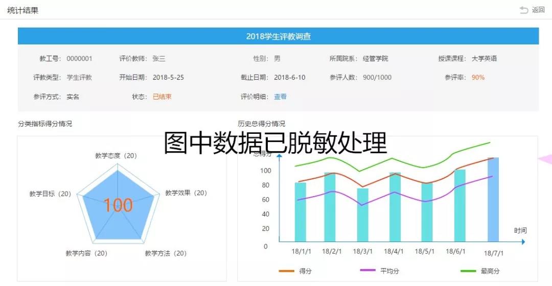 1 支持查看教師評測數(shù)據(jù)統(tǒng)計分析,可導出統(tǒng)計報表