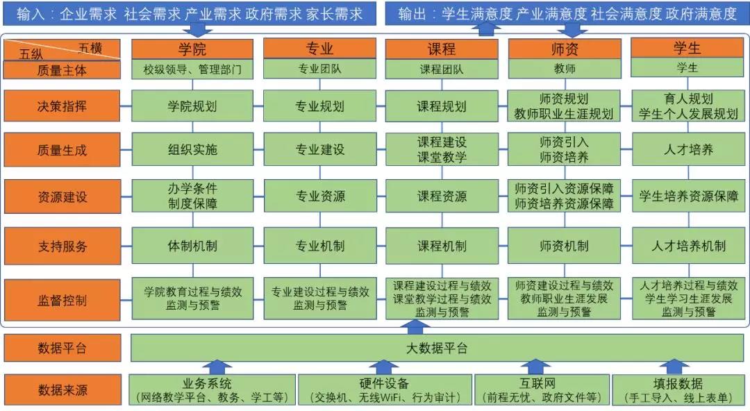建設(shè)“五縱五橫一平臺”內(nèi)部質(zhì)量保證體系,即按照決策指揮、質(zhì)量生成、資源建設(shè)、支持服務(wù)、監(jiān)督控制等五個系統(tǒng),從學(xué)校、專業(yè)、課程、教師、學(xué)生等五個層面,以校本數(shù)據(jù)平臺為依托,建設(shè)完整且相對獨立的自我質(zhì)量保證機(jī)制,逐步形成全要素網(wǎng)絡(luò)化的內(nèi)部質(zhì)量保證體系。
