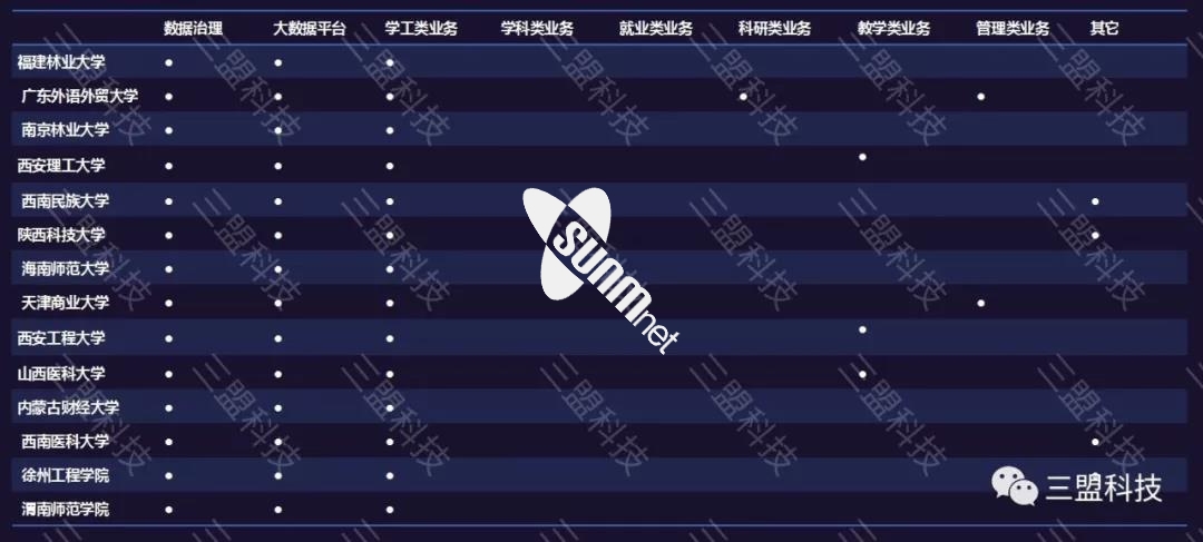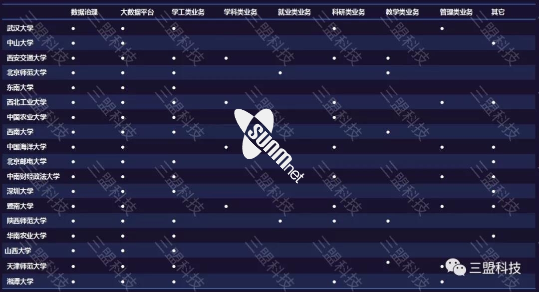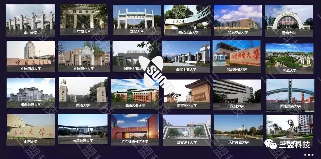 在教育大數(shù)據(jù)領(lǐng)域,三盟科技全國(guó)項(xiàng)目案例數(shù)量第一、模塊深度第一、銷(xiāo)售業(yè)績(jī)第一。大數(shù)據(jù)系列解決方案已經(jīng)成功在武漢大學(xué)、中山大學(xué)、西安交通大學(xué)、北京師范大學(xué)、東南大學(xué)、西北工業(yè)大學(xué)、中國(guó)農(nóng)業(yè)大學(xué)等近200所全國(guó)名校應(yīng)用,其中包含22所雙一流大學(xué)。