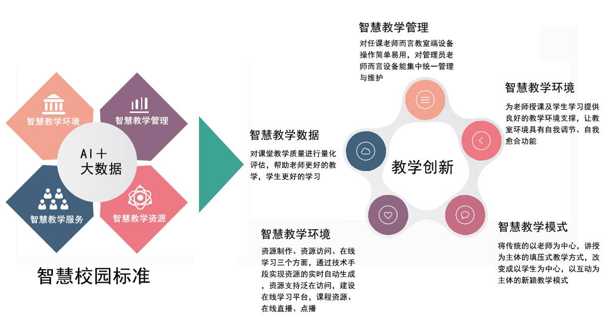 2018年6月,國家市場監(jiān)督管理總局、中國國家標準化管理委員會最新公布了國家標準文件《智慧校園總體框架(GBT36342-2018)》指出:智慧校園建設是基于大數(shù)據(jù)、人工智能、云計算、移動互聯(lián)及虛擬現(xiàn)實等信息化技術(shù),將學校物理空間和信息空間有機銜接,最終實現(xiàn)智慧校園管理、智慧校園服務、智慧教學環(huán)境、智慧教學資源的智慧校園。