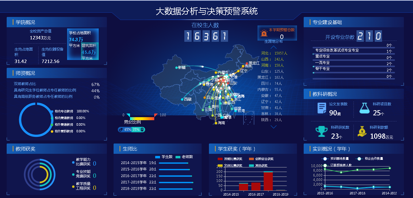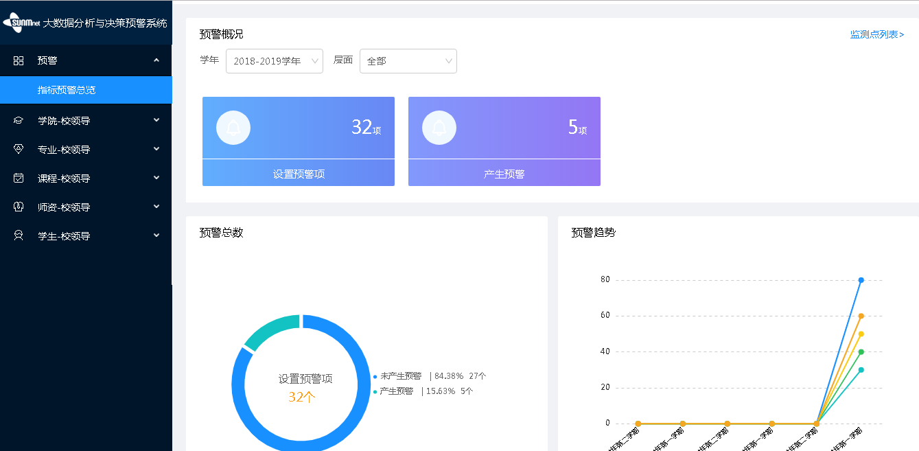 現(xiàn)在,大數(shù)據(jù)分析與決策預(yù)警系統(tǒng)提供診改決策數(shù)據(jù)支持及“五橫”畫像分析展示,具體提供包含學(xué)校、專業(yè)、課程、師資、學(xué)生維度的畫像展示。并且具有單獨的預(yù)警模塊,實時、動態(tài)的掌握全校發(fā)展,為及時糾偏提供大數(shù)據(jù)的支持。