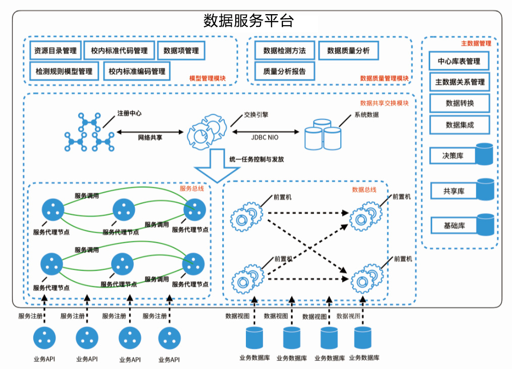 數(shù)據(jù)服務(wù)平臺(tái)是大數(shù)據(jù)時(shí)代的必然產(chǎn)物,是支撐學(xué)校數(shù)據(jù)管理的基礎(chǔ),是以“統(tǒng)一標(biāo)準(zhǔn)”、“統(tǒng)一處理”、“統(tǒng)一交換”、“保證質(zhì)量”、“透明開(kāi)放”的方式,為不同業(yè)務(wù)系統(tǒng)、不同數(shù)據(jù)庫(kù)、不同數(shù)據(jù)格式之間進(jìn)行數(shù)據(jù)交換而提供服務(wù)的平臺(tái)。
